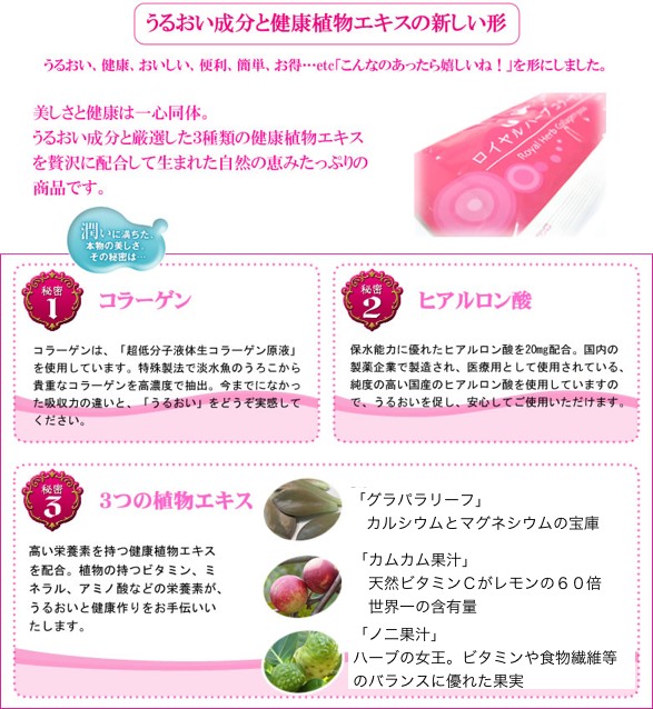 ・「低分子フィッシュコラーゲン」「ヒアルロン酸」「健康植物エキス」を贅沢に配合。地球が育んだ成分が体の中からあなたをやさしく包み込む。美と健康を追求し作られた、新しいコラーゲンドリンクです